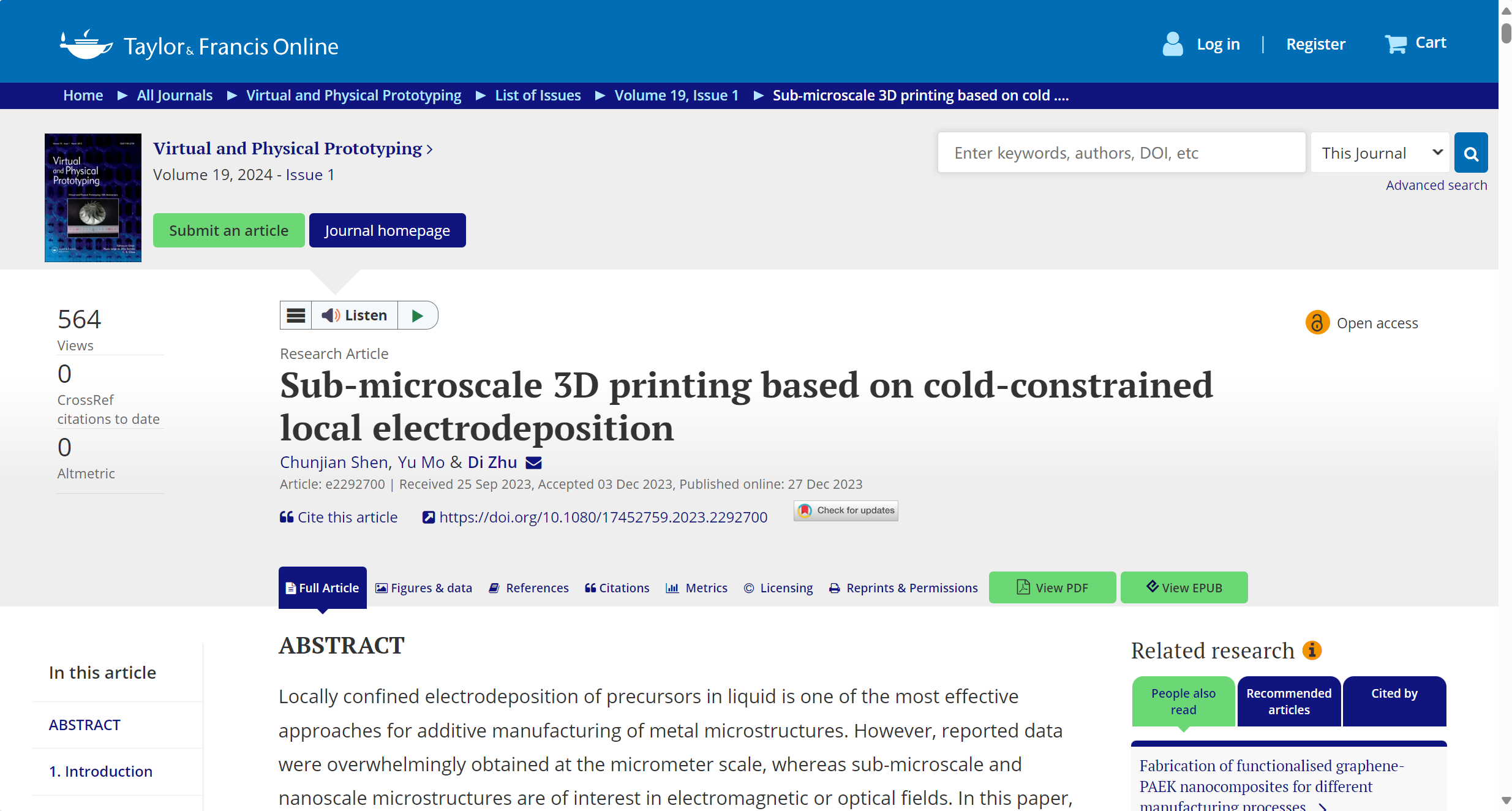 針對以上問題,南京航空航天大學團隊利用澤攸科技SEM納米力測量系統(tǒng)進行打印過程中的力監(jiān)測和控制,并結合CCLE技術,即一種基于冷約束局部電鍍的亞微米尺度3D打印技術,成功制備了亞微米尺寸的高質量三維銅結構。相關研究成果以“Sub-microscale 3D printing based on cold-constrained local electrodeposition”發(fā)表在Virtual and Physical Prototyping期刊上。